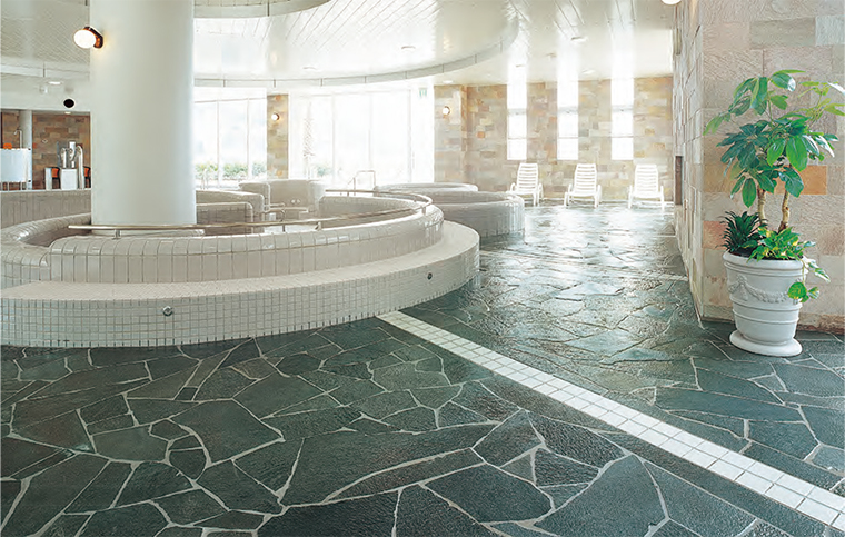 - 浴室や大浴場、プールサイドの床では、石鹸や皮脂、その他の汚れなどが付着して滑りやすくなる場合があります。適切な洗浄・保護などメンテナンスが必要です。